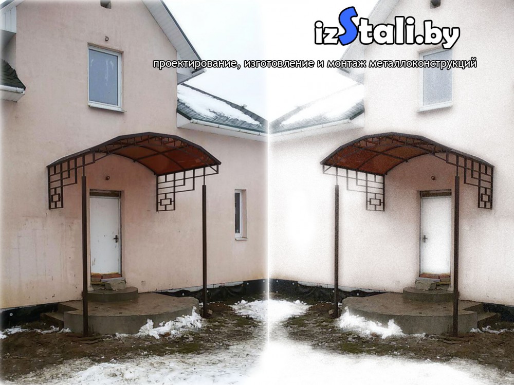 При существенном увеличении размеров козырька из поликарбоната, этот козырёк постепенно приобретает новые функции. Теперь он может защитить не только входную дверь, но и крыльцо.