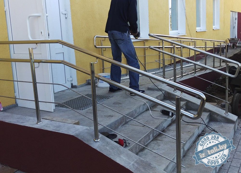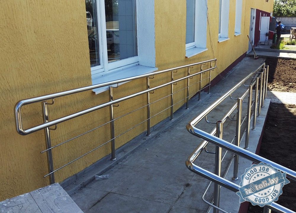 Ограждения из нержавеющей стали были смонтированы на внутренних лестницах, а также на крыльце и пандусе входной группы. Зеркальная поверхность материала впитала в себя все окружающие краски и гармонично вписалась в интерьер и экстерьер здания, придав ему законченный современный вид. Изделие способно сохранить свой изящный внешний вид свыше 50 лет.